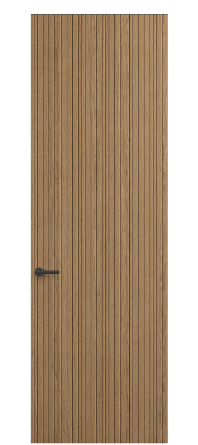 Селект — коллекция минималистичных дверей с фрезеровкой по натуральному шпону. Рельеф на поверхности полотна создаёт игру света и тени, добавляя пространству динамичности и визуального объёма. Двери Селект в сочетании со стеновыми панелями и мебельными фасадами, повторяющими лаконичный дизайн, создают единое стилевое решение.
