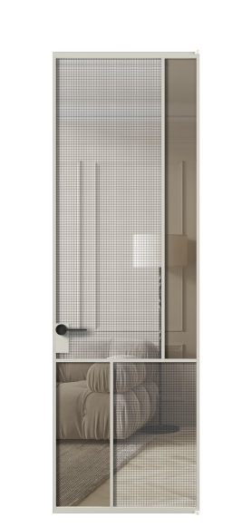 АЛПЛ041.21 Алюминий тёплый серый Декоративное стекло с сеткой "Mesh silver", триплекс, 6 мм + Прозрачное бронзовое стекло, триплекс